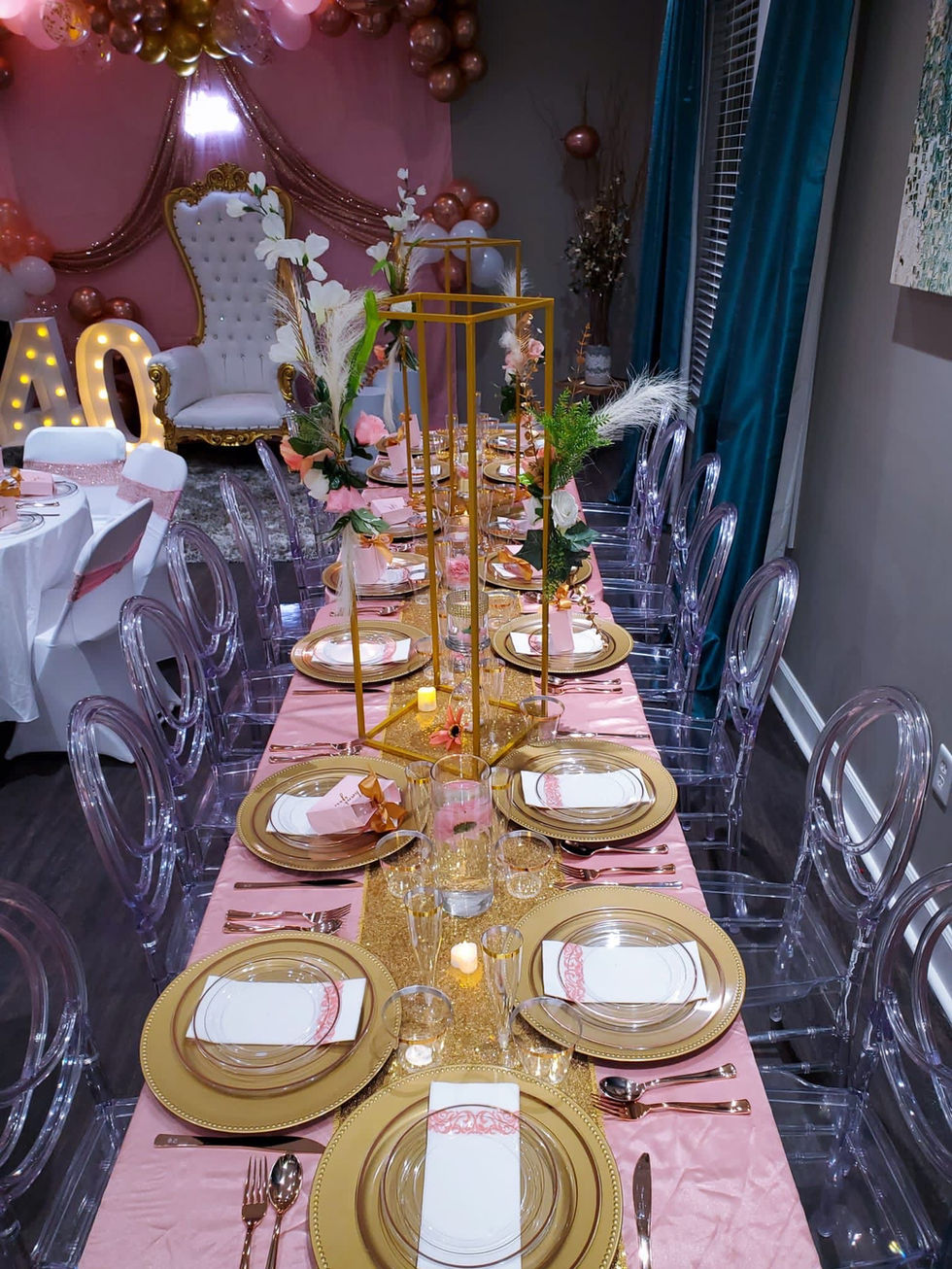 This project features elegant event table setups with pink and gold decor, creating a luxurious and opulent ambiance. The combination of pink and gold accents adds a touch of glamour to any event table setting.